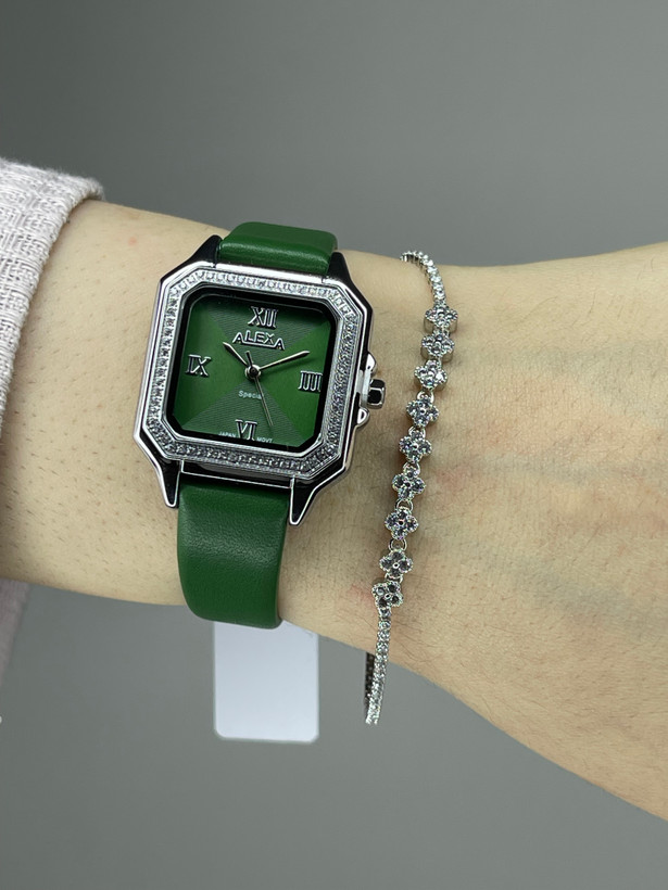 ساعت زنانه برند الکسا بند چرم ،با صفحه مربعی دور نگین مخراجی اصل بدون ریزش،